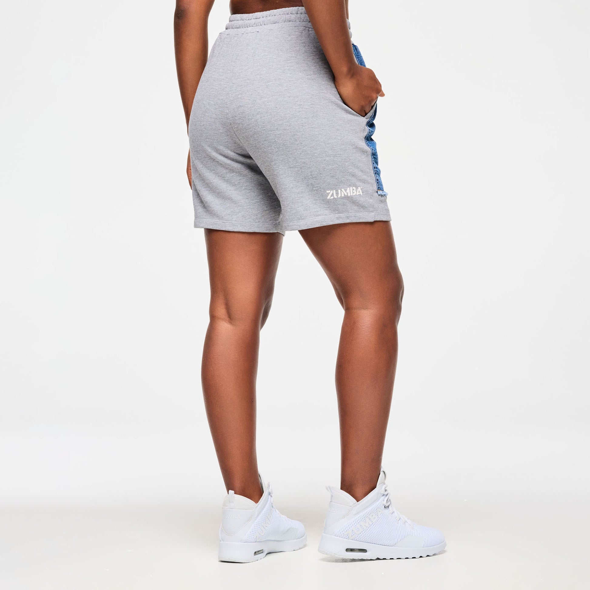 These Blue Jean Denim Shorts feature a 6 1/2" inseam and blend stretch denim with soft French terry for maximum comfort and flexibility. The encased elastic waistband with functional drawcords ensures a customizable fit, while inseam pockets add practicality. A double-layered front with a raw edge finish gives a stylish touch. Designed for movement, their easy, dance-ready fit and bold color block panels make them perfect for Zumba, running errands, or relaxing after class. These shorts effortlessly combine function and fashion for an active lifestyle.