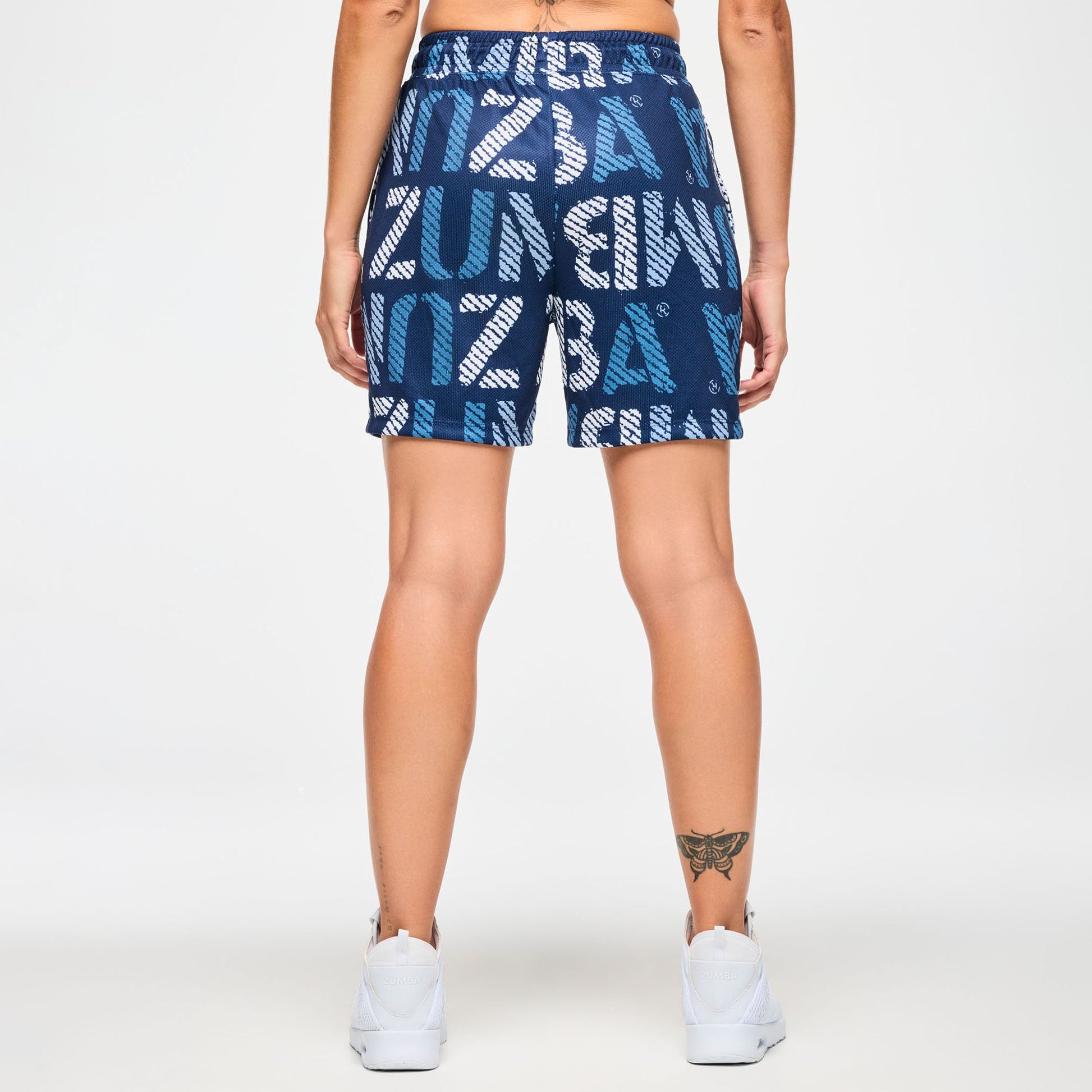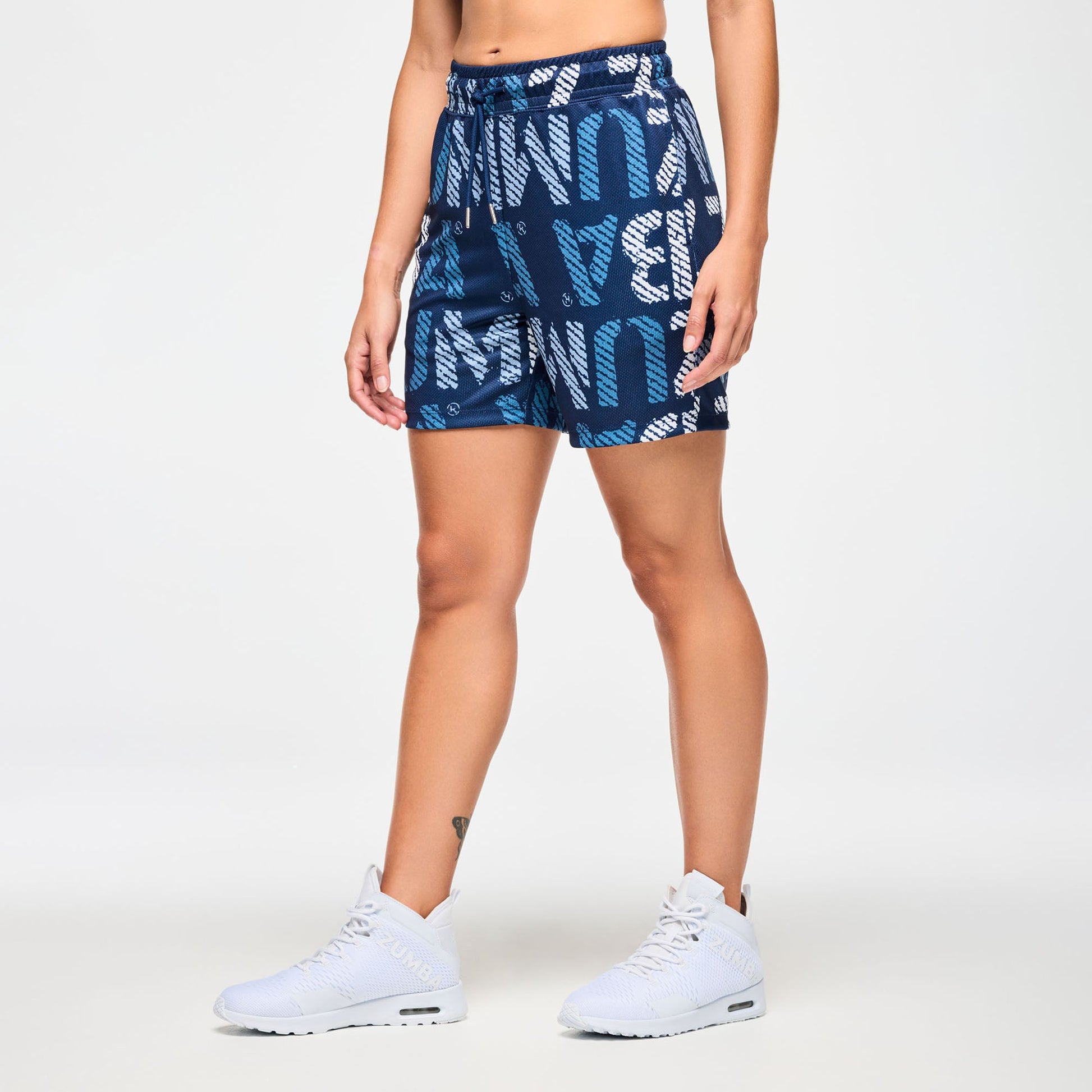 These Blue Jean Mesh Shorts feature a 5.5" inseam and convenient inseam pockets. Designed with an internal elastic waistband and visible drawcords, they offer a secure, adjustable fit. Showcasing a unique Zumba-exclusive allover print, these shorts provide a comfortable, easy fit with a flattering short length.