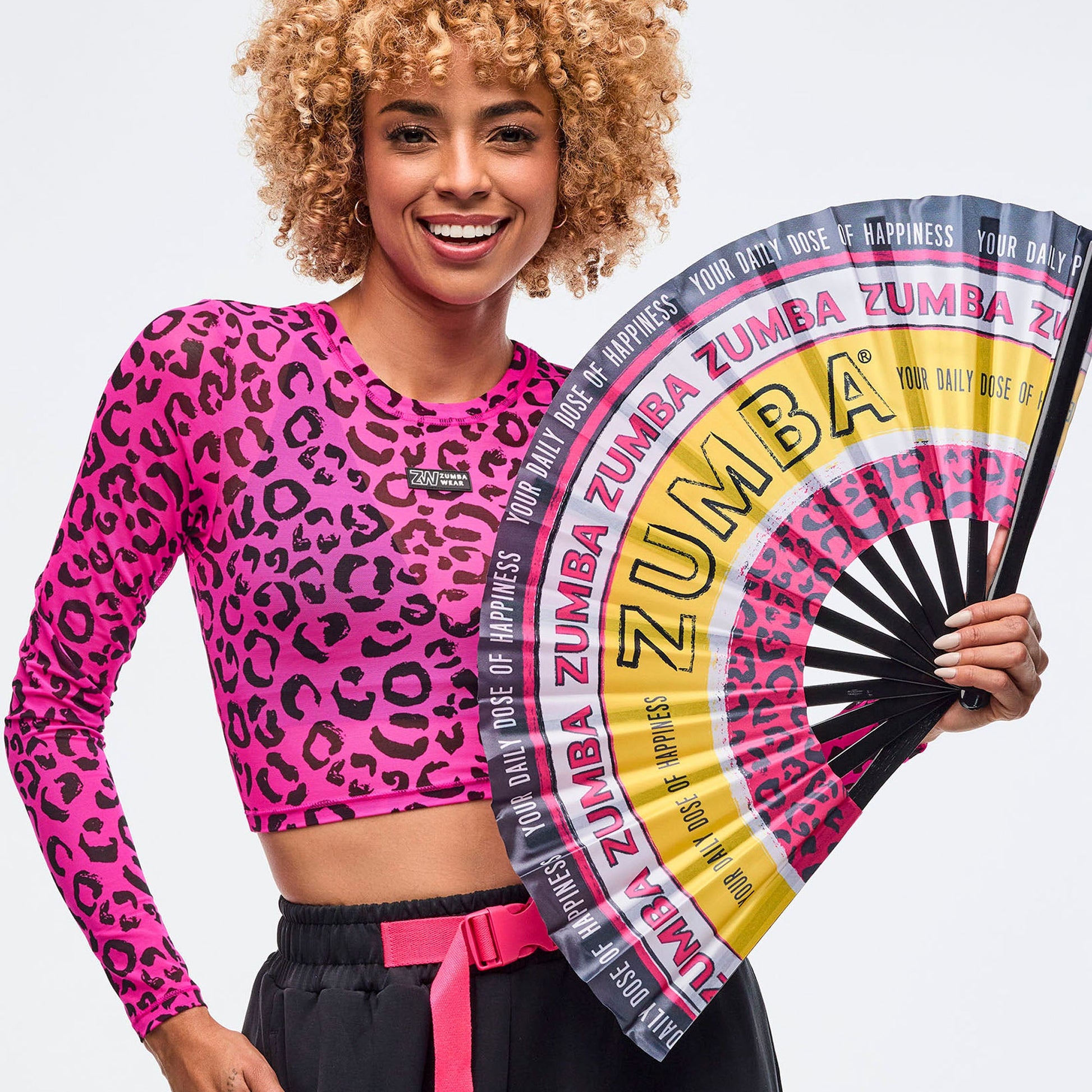 - Hand-painted style fan body with motivating phrases, animal print, and oversized Zumba's in pink, yellow, white, and black