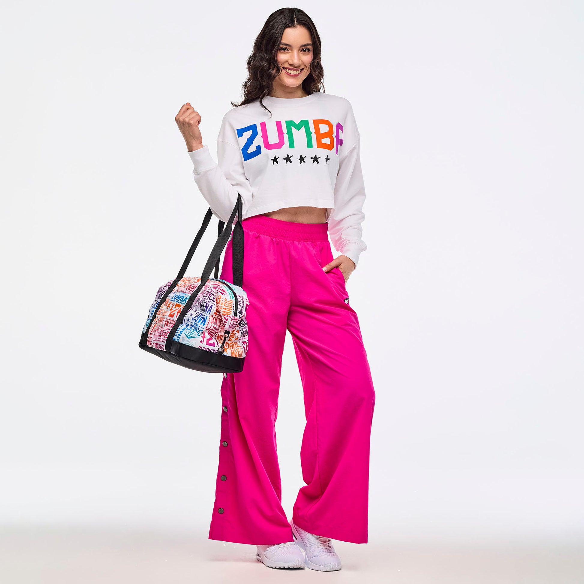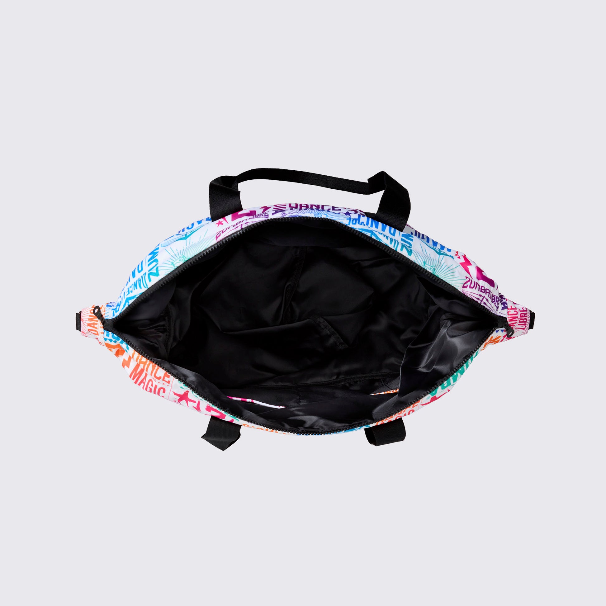 - Body Printed with a rainbow gradient Zumba all over print with a white background