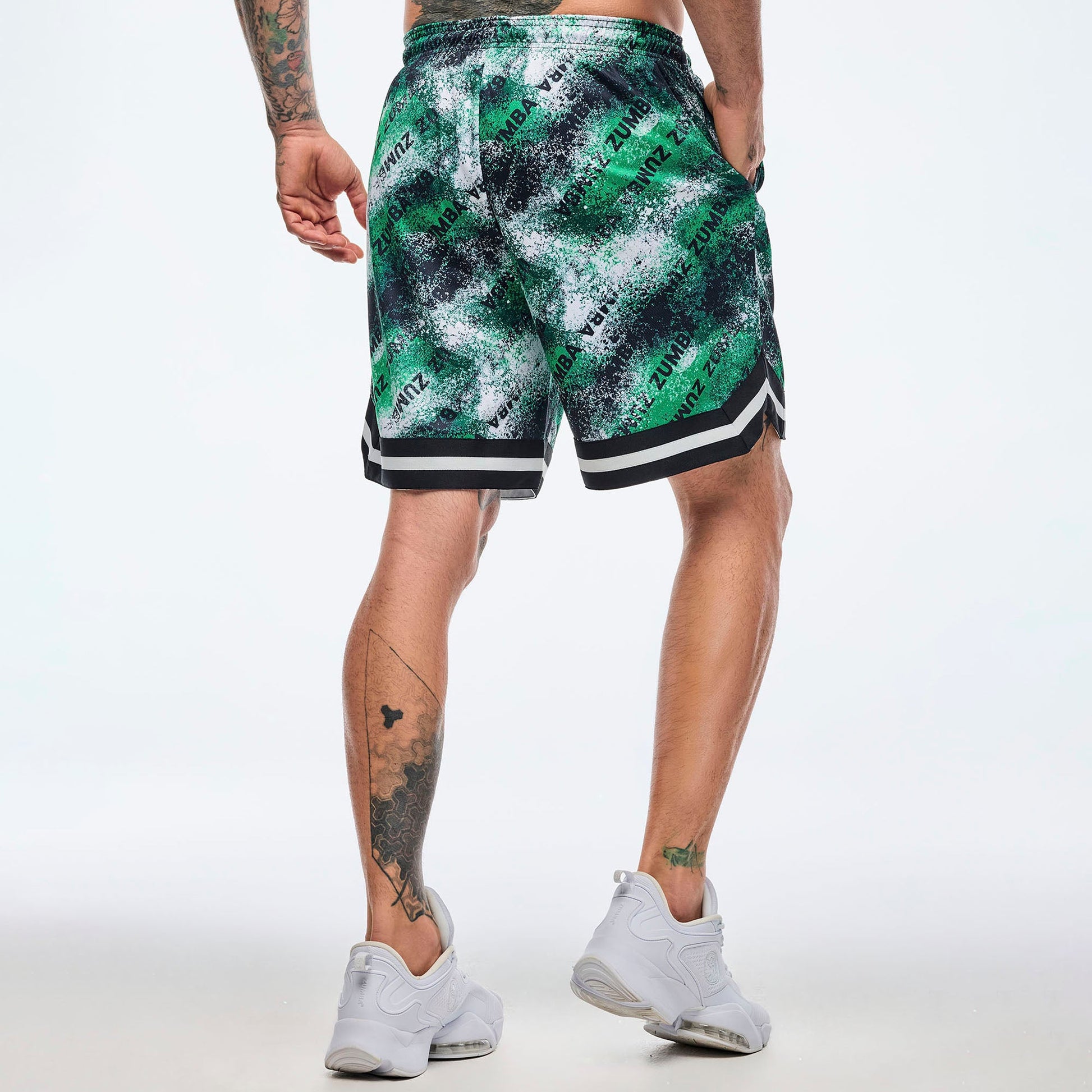These men's mesh shorts feature a 7" inseam with a striped rib-knit trim at the hem and angled side vents for added comfort. Designed with an encased elastic waistband and drawcord, plus side seam pockets, they offer an easy fit and short length. Finished with an exclusive Zumba all-over print, these shorts combine performance with style.